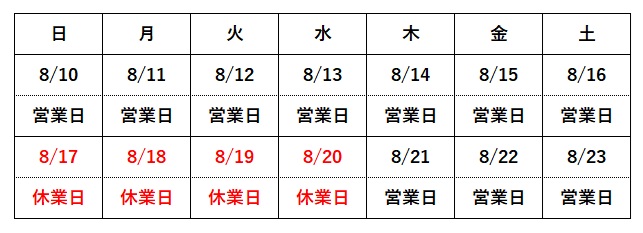 2025年8月17日(日)~8月20日(水)は、休業日とさせていただきます。